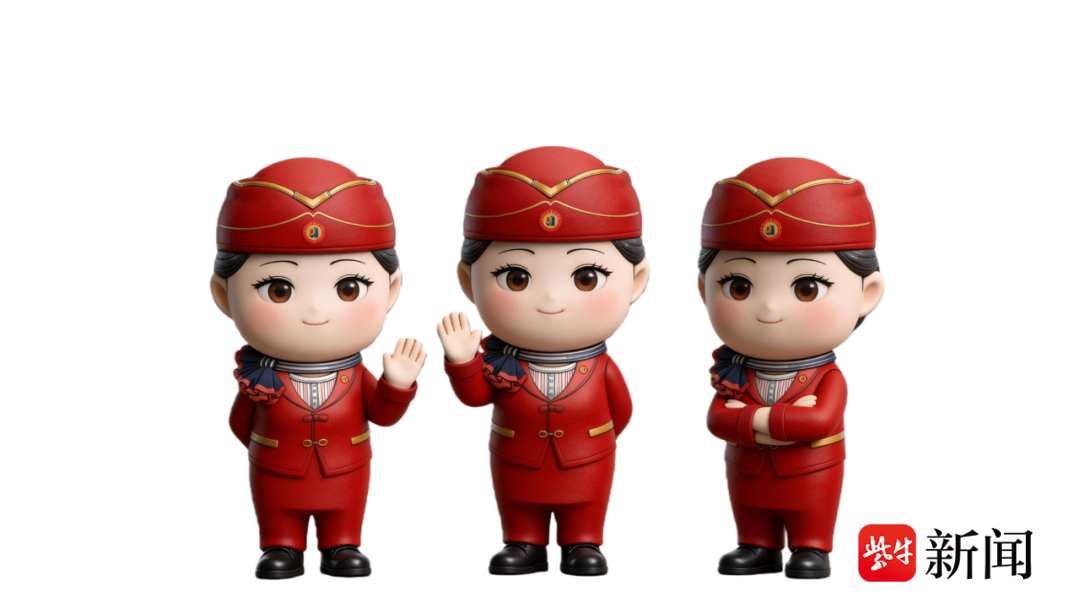 IP形象提取了现代空乘制服元素并加以创新,保留了空乘制服的主体色调如藏青、深紫、正红等经典色,融入惠山泥人传统图案如牡丹、云纹等吉祥纹样,以彩绘、浮雕形式装饰制服领口、袖口、裙摆。其中,最具代表性的是江影数字人“小影”的空姐形象,身着中国红空乘制服,既彰显传统文化底蕴,又传递空乘服务的热情与专业。