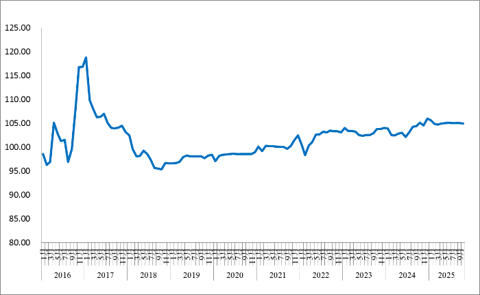 2025年10月份,由中国物流与采购联合会和林安物流集团联合调查的中国公路物流运价指数为104.9点,环比回落0.10%,同比去年回落0.11%。从月内看,第二、三、四周运价指数环比回升,第一、五周运价指数环比回落。